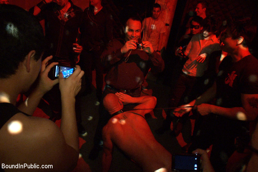 Over a hundred guests show up for BIP launch party, including local celebs and the media. Josh West takes Patrick Rouge who is bound and blindfolded through the crowd. Patrick is made to greet the guests by sniffing their crotches and he begs for them to take off his clothes. Most of the public just want to be voyeurs and stay in the shadows but many whip out their cocks for Patricks mouth and ass. It gets real horny as the night progresses and Patrick gets tied up on a bed in the middle of the room. Party goers pour drinks on him, spit on him and even cum all over him.